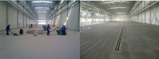 北航車(chē)庫(kù)泵送施工現(xiàn)場(chǎng) 機(jī)場(chǎng)T3A行李分檢去手工施工現(xiàn)場(chǎng) 1、 澆注前須確保基面上無(wú)積存的底涂乳夜。 2、 大面積施工應(yīng)用泵送。如果不得不用手工施工,則應(yīng)事先分區(qū)以保證一次性連續(xù)地澆注完整個(gè)區(qū)域。 3、 將攪拌好的流態(tài)自流平材料在可施工時(shí)間內(nèi)傾注到基面上并完成放氣滾軋工藝。應(yīng)澆注成條狀,并確保現(xiàn)澆條與上一條能流態(tài)地融合在一起。 4、 澆注的條狀自流平材料應(yīng)達(dá)到設(shè)計(jì)厚度。如果自流平施工厚度設(shè)計(jì)小于3mm,則需使用專(zhuān)用齒口刮板加以控制。 5、 穿釘鞋迅速用專(zhuān)用放氣滾筒軋澆注過(guò)的自流平地面已排出混合時(shí)帶入的空氣、避免氣泡、麻面及條與條之間的接口高低差。 五、 用過(guò)的工具和設(shè)備應(yīng)及時(shí)用水清洗。 六、 養(yǎng)護(hù) 通常不需要進(jìn)行養(yǎng)護(hù),但如果環(huán)境溫度很高,太陽(yáng)直射,空氣干燥等須進(jìn)行養(yǎng)護(hù),將塑料膜罩在剛硬化的自流平表面養(yǎng)護(hù)二天。