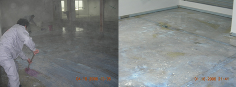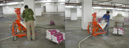 涂刷底涂劑現(xiàn)場(chǎng)施工圖 基面上必須刷上底涂以防止自流平出現(xiàn)空洞和針眼。底涂采用自流平專(zhuān)用底涂,一般在基面上刷二次底涂。刷底涂之前應(yīng)確保基面無(wú)明水。第一次,將專(zhuān)用底涂和水以1:6體積比勾兌,然后將底涂刷在基面上,確保基面上有足夠的底涂;第二次,等第一遍的底涂干后將沒(méi)有勾兌水的底涂按照1:4直接刷在地面上。等底涂干后才能澆注自流平材料。 三、 泵送和手工施工